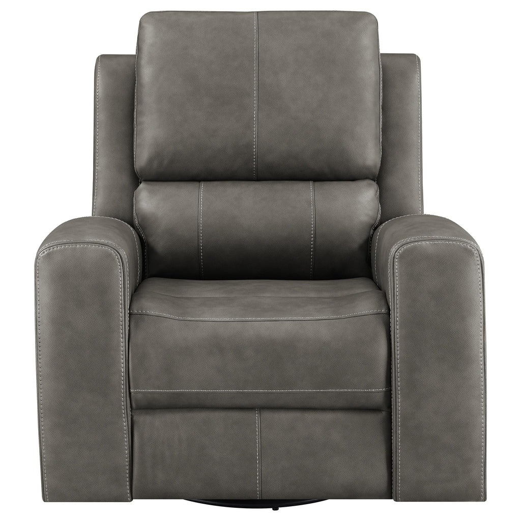 This triple power recliner chair invites you to unwind with motion, support, and quiet luxury. Wrapped in soft leatherette upholstery, it offers a supple touch that enhances every moment of rest. A gliding and swivel base flows effortlessly while plush cushions and contouring lumbar support cradle the body. Power headrest, lumbar, and recline functions adjust at your command. Hidden cup holders and built-in USB A and USB C ports add thoughtful convenience, while an emergency power-down port offers peace of mind. Key Features: • Triple power recliner chair with glider and swivel functions delivers motion-based comfort • Charcoal leatherette finish pairs with clean lines and deep channel-stitched back cushions • Power recline, headrest, and lumbar adjust easily with ergonomic control panel • USB A and USB C ports built into the panel for effortless device charging • Armrests conceal stainless steel cup holders for discreet beverage storage • Emergency power-down battery port provides added function during power outages