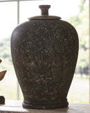 Bring an air of useful objet dart to your space with this decorative jar. With an antiqued black finish and wooden top this piece blends easily into so many styles.