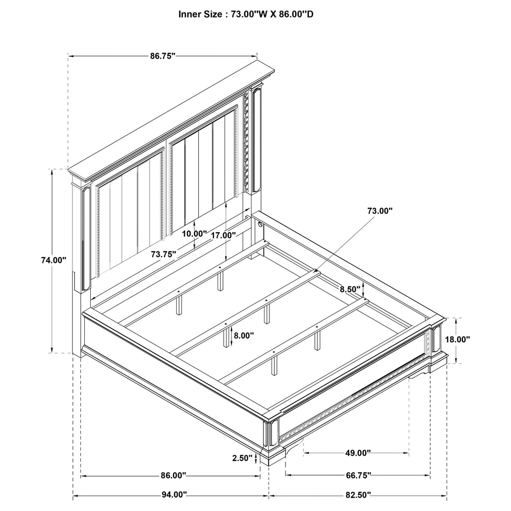 Infused with vintage elegance and practical design, this panel bed offers timeless structure with thoughtful detail. Ornate molding and recessed panels lend refined character, while a distressed white finish softens the frame with antique charm. Dual LED reading lights are subtly tucked beneath the crown—one on each side—casting focused illumination downward. Crafted from poplar and engineered wood, it brings beauty and everyday function into perfect balance. Key Features: • Queen panel bed with crown molding and carved accents for traditional charm • Vintage white finish showcases distressed texture with timeless elegance • Dual LED reading lights under crown cast focused light on each side of the bed • Recessed headboard and footboard panels add sculptural depth and structure • Requires foundation for mattress elevation and traditional support • Crafted from poplar, engineered wood, and plywood for long-lasting visual appeal