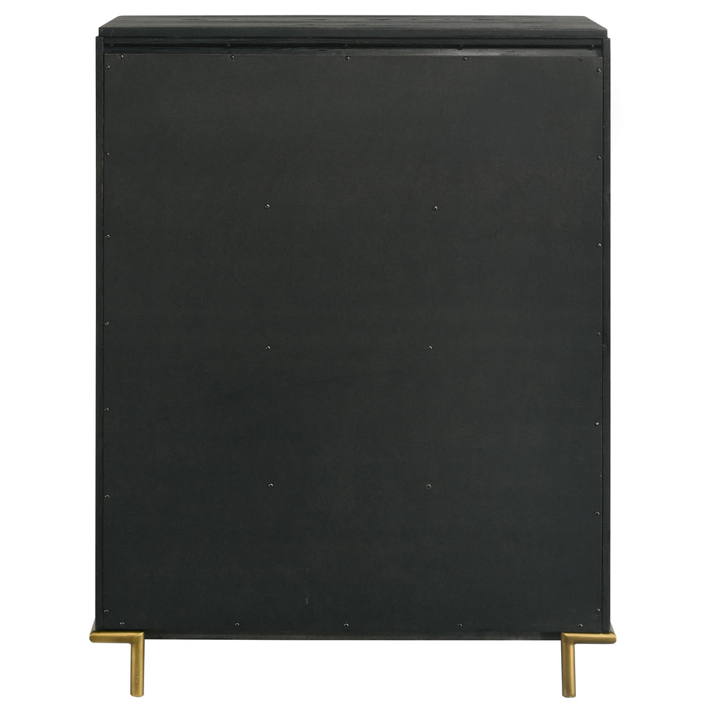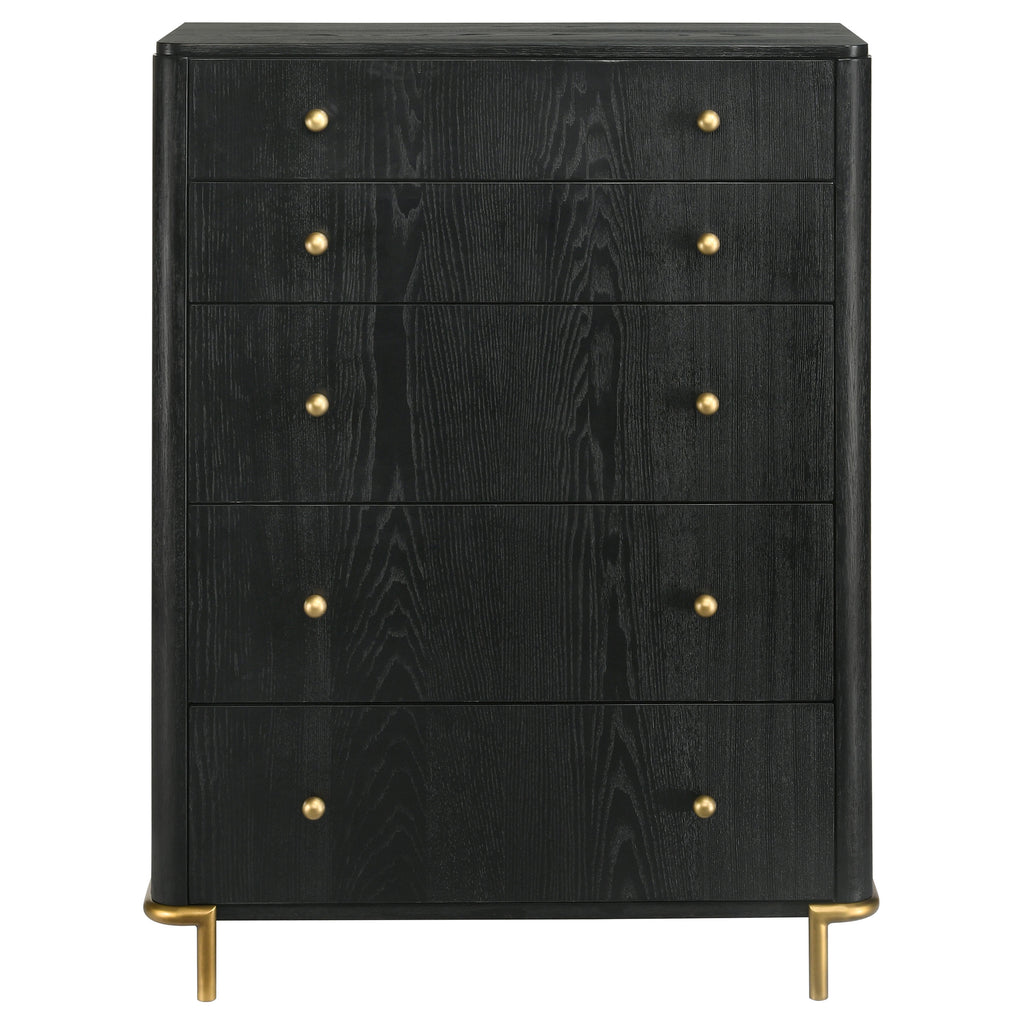This mid-century modern five-drawer chest combines refined simplicity with thoughtful detail. A warm sand wash finish highlights the wire-brushed texture of the wood, creating natural depth and dimension. The aged brass knobs and slim metal legs add a sophisticated metallic accent, while softly rounded corners lend a smooth, contemporary look. A felt-lined top drawer offers a secure place for delicate items, making this chest a stylish and functional addition to any modern or transitional bedroom._x005F_x000D_ Key Features: • Five-drawer chest in warm sand wash wire-brushed wood finish • Aged brass knobs and legs add modern mid-century sophistication • Felt-lined top drawer protects jewelry and delicate accessories • Rounded corners create a soft, refined silhouette and smooth profile • Crafted from rubberwood, engineered wood, and ash veneer materials • Spacious drawers provide elegant and practical bedroom storage