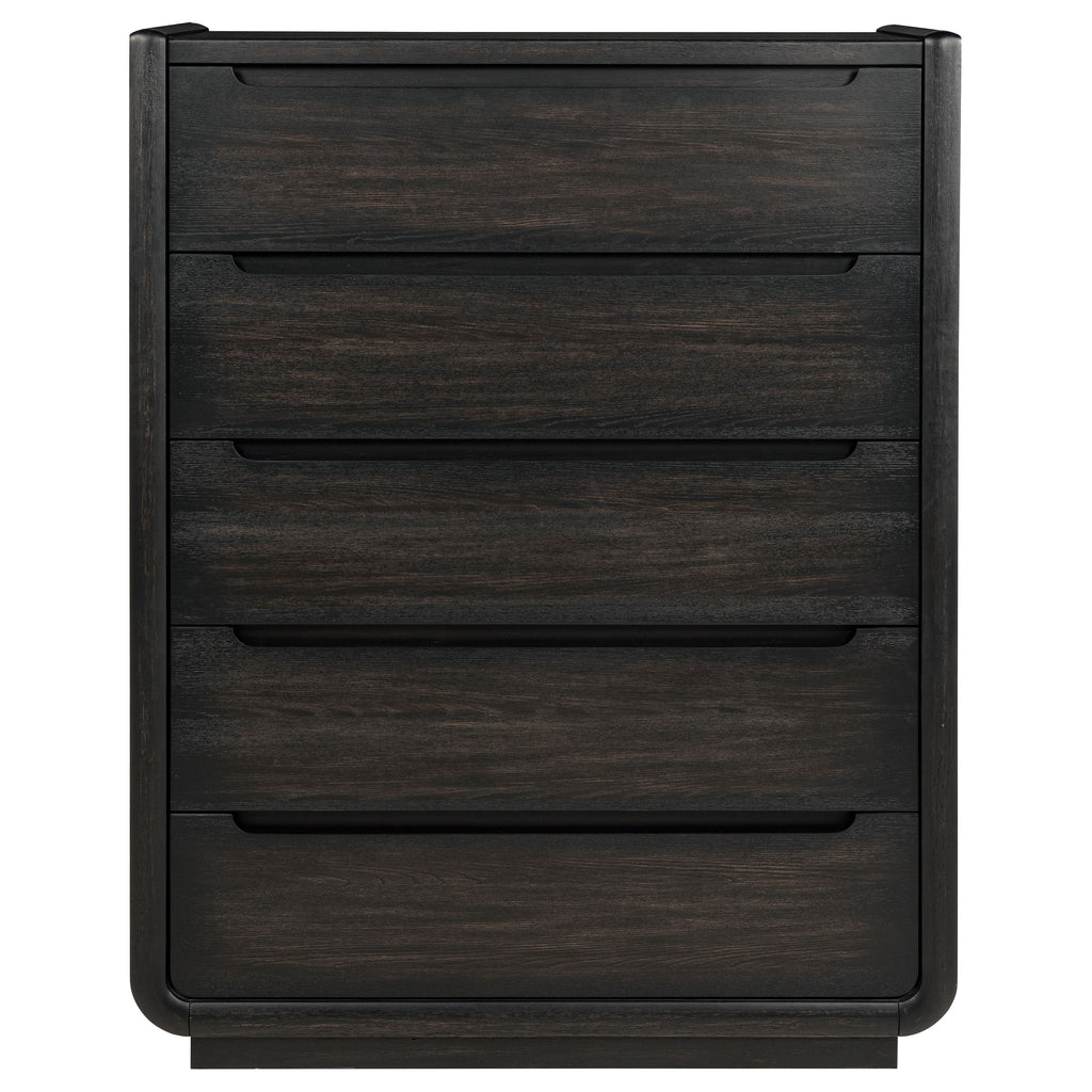 Balance and beauty meet in this five-drawer chest, where softened curves and a deep burnished black finish bring quiet depth to the room. Recessed pulls and rounded corners echo a modern sensibility, while black felt-lined top drawers protect what matters most. Designed with English dovetail joinery, soft-closing glides, and a fully enclosed dust panel, this tall silhouette blends sculptural refinement with everyday function. Key Features: • Five-drawer chest in burnished black with rounded edges and sculpted minimal lines • Top drawer lined in black felt to cradle jewelry, watches, and other essentials • Soft-closing ball bearing glides ensure smooth, quiet drawer function • English dovetail drawer construction enhances durability and craftsmanship • Dust panel base provides fully enclosed storage and a clean internal finish • Crafted from Asian hardwood, engineered wood, and ash veneer for strength
