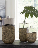 Give your space a contemporary vibe with this vase set. This set of 3 vases is crafted of mouth-blown antiqued goldtone finished glass with heavy sand texture making this unique design a stand out in your home.