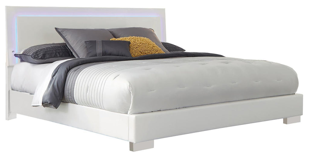 Illuminate your bedroom with the modern design of this LED bed. The headboard features a sleek white high gloss frame with built-in blue LED lighting, operated by a touch switch for convenience. The bed frame is upholstered in smooth white faux leather, enhancing its contemporary appeal. Designed for style and comfort, this bed brings a striking yet functional centerpiece to your space, blending modern aesthetics with subtle ambient lighting.