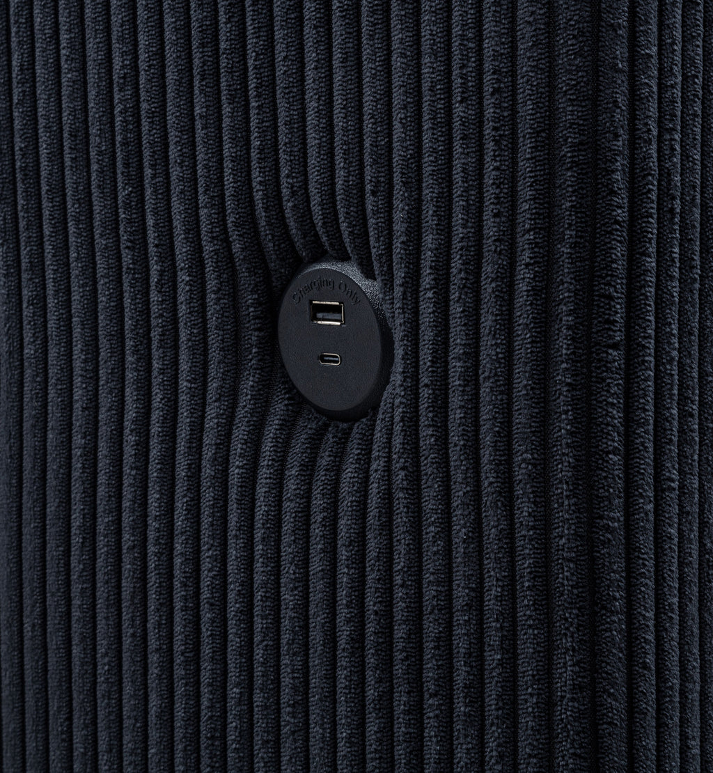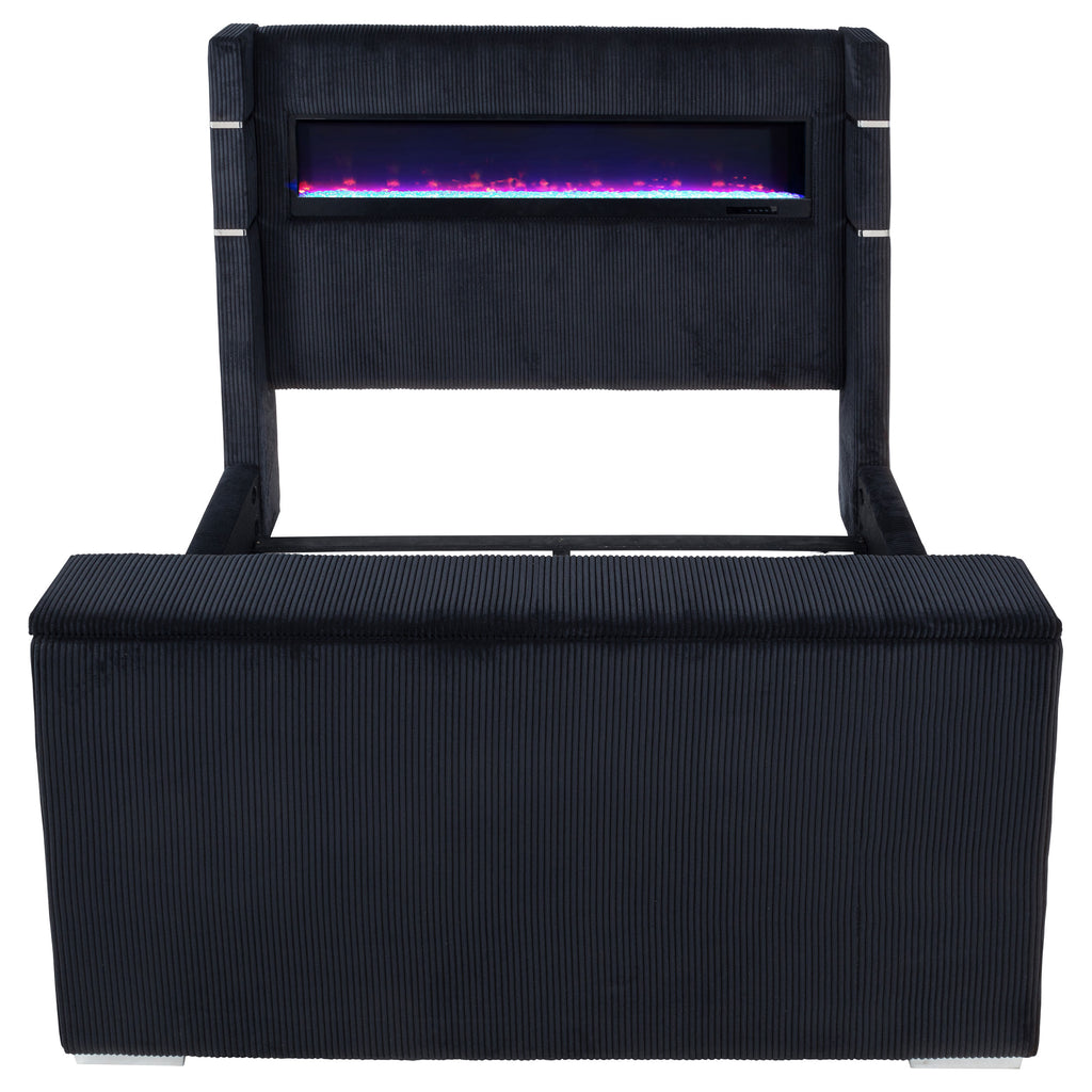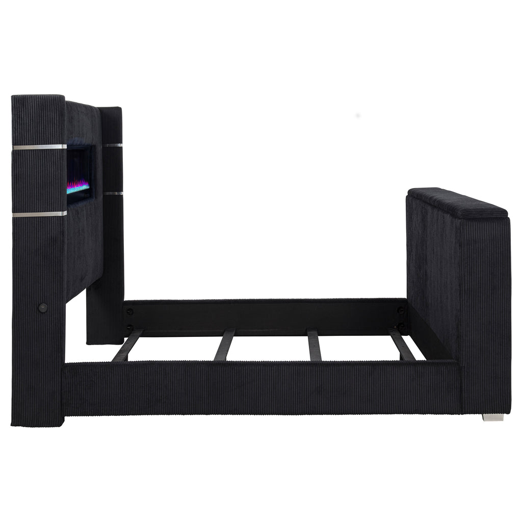 This innovative wingback bed levels up a top-selling design with bold tech upgrades and plush texture. A hidden motorized TV mount rises from the footboard via remote control, supporting screens up to 50 inches and tucking neatly away when not in use. The headboard’s flame visualizer glows over shimmering crystal rocks with sixteen color settings. Dual USB-A and USB-C ports on each side keep devices powered. Upholstered in soft, faux fur-style corduroy over a solid pine frame. Key Features: • Queen wingback bed upgraded with motorized TV lift in footboard and remote-controlled flame box • Plush black faux fur-like corduroy fabric delivers striking, tactile softness and bold style • Hidden footboard TV rack accommodates up to fifty-inch flat screens with smooth lift • Headboard includes crystal flame visualizer with sixteen color options and no heat output • Dual USB-A and USB-C ports on each side of headboard provide fast, convenient charging • Solid pine frame and seven-foot electrical cord ensure reliable structure and easy power access