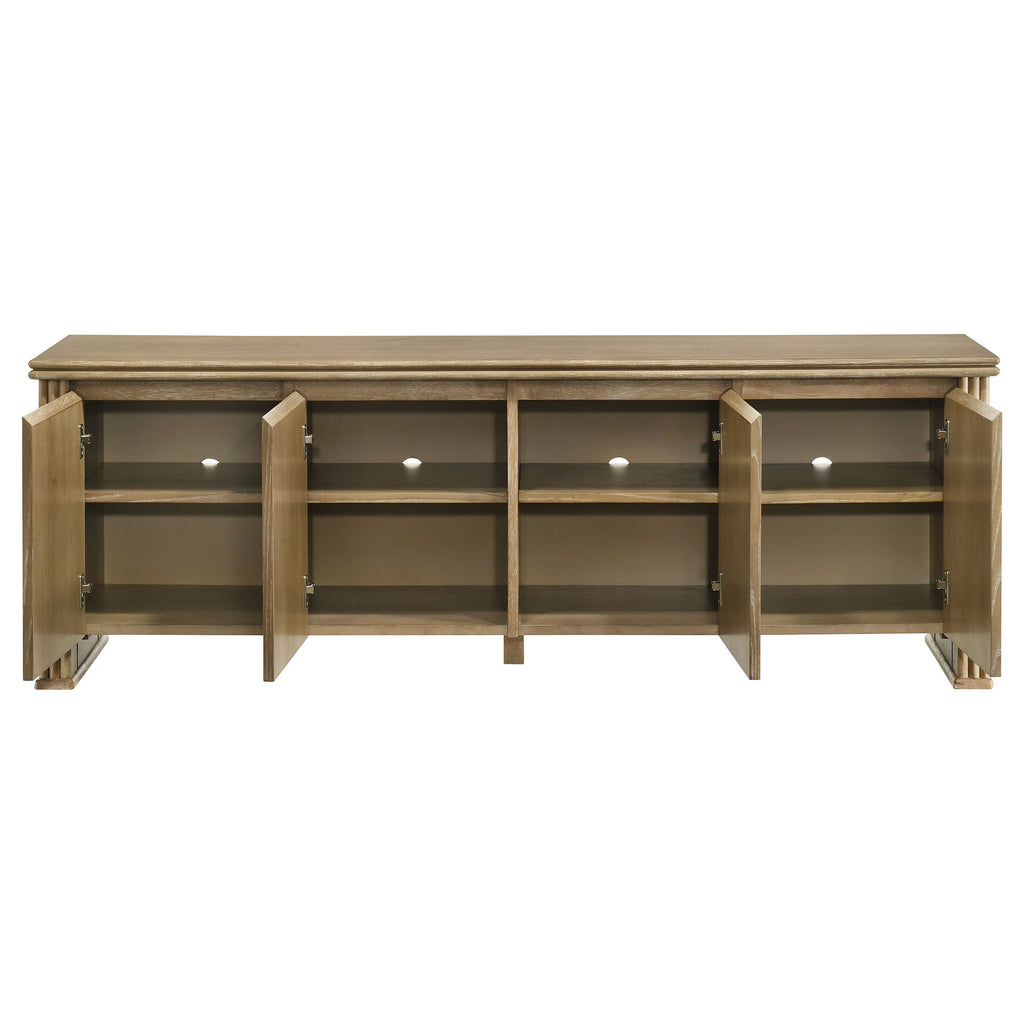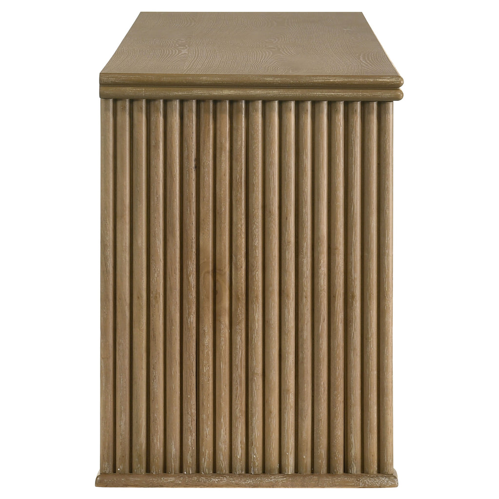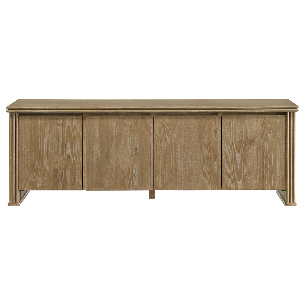 This seventy-inch TV stand combines sculptural texture and functional storage for a grounded living room anchor. Four flat-panel doors conceal generous interior space, complete with adjust shelving and rear cable access cutouts for organized media setup. Vertical reeding along the sides adds visual rhythm to the clean-lined form, while a distressed light brown finish highlights the natural grain. Built from engineered wood and ash veneer, this media console offers both form and utility. Key Features: • TV stand with fluted side detailing adds bold structure and sculptural visual appeal • Distressed light brown finish emphasizes woodgrain with a warm, natural tone • Flat-panel door fronts conceal spacious interior storage with adjustable shelf supports • Rear cutouts provide streamlined cable management for organized media display • Crafted from engineered wood with ash veneer for durability and subtle texture • Easily supports flat-screen TVs up to seventy-five inches for versatile living room setups