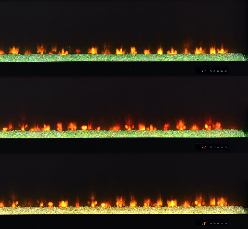 This sleek fireplace media console brings warmth and streamlined storage to contemporary living spaces. A wide electric firebox glows over crushed acrylic crystals, offering fifteen customizable flame colors operated by a wireless remote. Open side compartments with adjustable shelves store devices or décor, while rear cable management cutouts keep wires out of sight. Finished in classic black and crafted from engineered wood with a laminate veneer, it serves as a refined TV stand or entertainment center. Please note that this console does not include a heat function. Key Features: • TV stand fireplace console with flame visualizer and crushed acrylic crystals for visual warmth • Black finish highlights clean lines and adds bold, modern character to any space • Two open side compartments with adjustable shelves offer flexible display or storage • Fifteen flame colors with wireless remote control for lighting customization • Crafted from engineered wood and durable, scratch-resistant laminate veneer • Accommodates TVs up to eighty-five inches with rear cutouts for cable management