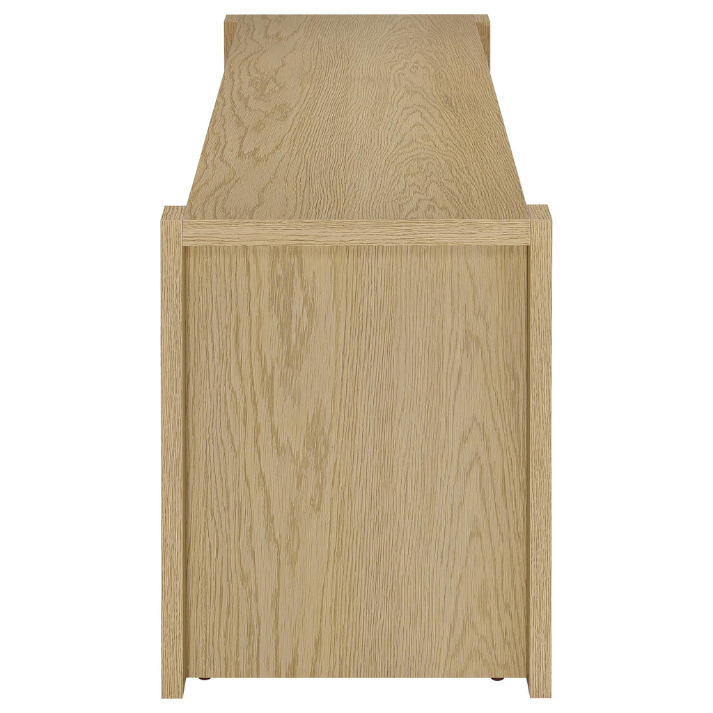 Clean lines and a calming finish define this two-door TV stand, where function meets refined simplicity. The open center shelves are perfect for consoles or display, while each door opens to reveal an adjustable shelf for tailored storage. Discreet cord access at the back keeps your setup neat and clutter-free. Crafted from engineered wood with a scratch-resistant and eco-friendly laminate veneer, its light oak finish brings an airy, organic warmth to your living room or media space. Key Features: • TV stand with open shelving and two hidden compartments in a light oak woodgrain finish • Light oak surface delivers natural warmth with a clean-lined, contemporary presence • Two center shelves are ideal for media players, décor, or everyday tech essentials • Each cabinet door conceals an adjustable shelf for flexible, enclosed storage • Rear cord cutouts offer easy wire management and support up to 65 inch TVs • Crafted from engineered wood, melamine paper, honeycomb board, and laminate veneer