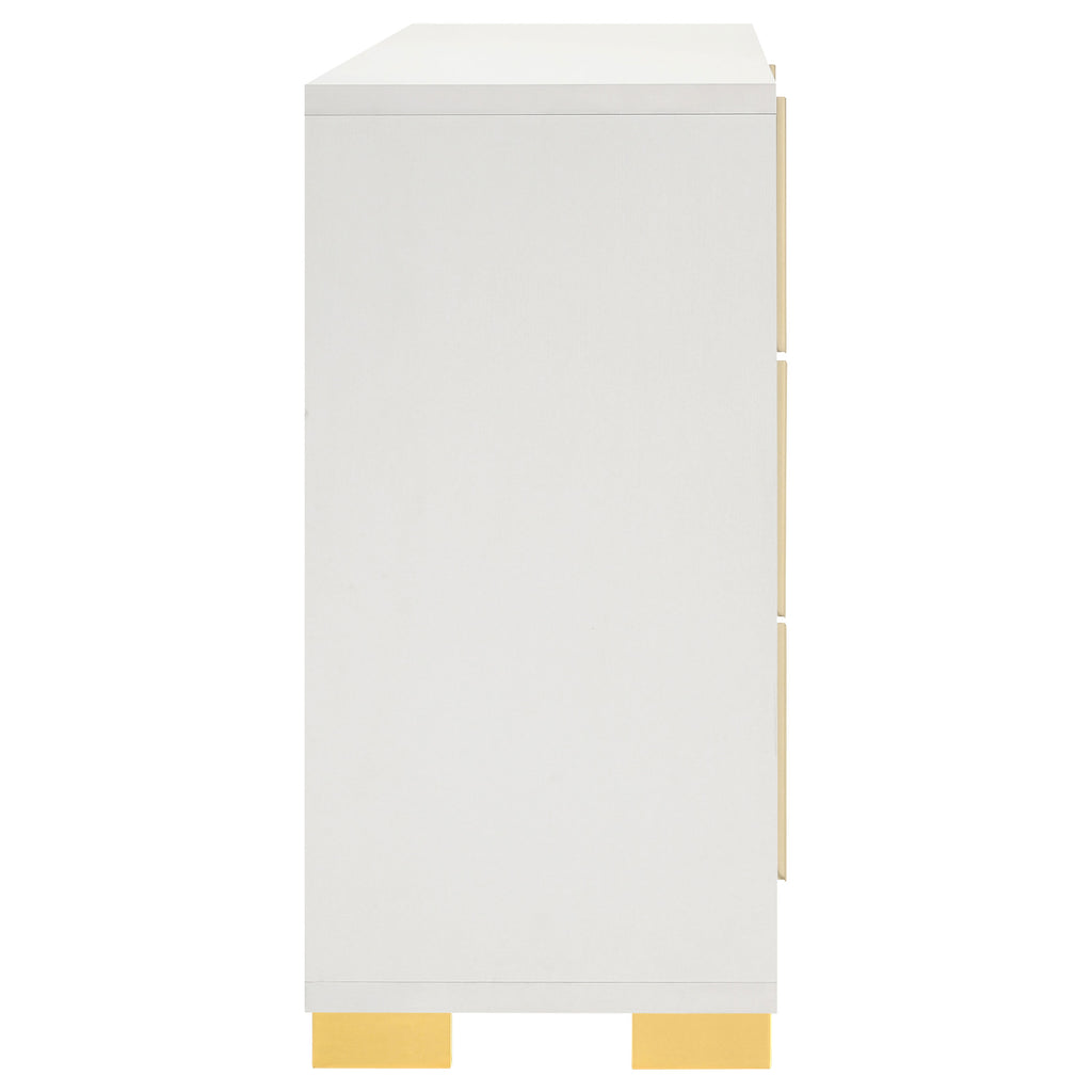 Soak up the sleek and simple yet compelling look of a six-drawer dresser with a dramatic aesthetic that changes the tone of your contemporary bedroom. Modern design details produce a chic vertical dresser with an Art Deco vibe and tons of storage space. Made of wood products, this six-drawer dresser features a versatile finish with glam accenting from gold finish metal, placed carefully to emphasize a geometric linear effect. Store incidentals and accessories in drawers operating smoothly on center metal glides. English dovetail drawer construction embellishes this dresser’s quality, as vertical gold metal drawer hardware offers a unique impact. Key Features: • Sleek and simple six-drawer dresser with dramatic aesthetic to change tone of contemporary bedroom • Modern design details with chic Art Deco vibe and tons of storage space • Made of wood products with versatile finish and gold finish metal accenting for geometric linear effect • Drawers operating smoothly on center metal glides with English dovetail drawer construction • Vertical gold metal drawer hardware for unique impact