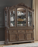 This dining room buffet and hutchs uniquely luxurious interpretation of traditional style says it all. Beautifully ornate elements include scrolled acanthus accents a lighted and mirrored interior with beveled glass panels. Exquisitely detailed and treated to a multi-hued finish its clearly a labor of love. Two lower cabinets and three drawers in the buffet plus glass-shelved cabinet space in the hutch serve your storage needs exceptionally well.