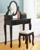 This charming vanity is the very definition of a team player. Whether your look is traditional or modern farmhouse the clean lines and crisp white finish of this vanity set will fit right in. Graceful curved legs are simply elegant. The attached swivel mirror and matching upholstered stool are lovely reflections of your good taste. A smooth-glide drawer and two accessory drawers keep the top uncluttered and essentials close at hand.