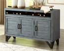 Versatility is key and you can swing wide the doors of opportunity with this bar cabinet. The antique blue finish and three paneled doors add a fresh farmhouse feel while the antiqued black hardware and sled legs add an urban vibe. With removable wine racks and two shelves this piece provides your home with usage options from hidden bar to television stand to dining room buffet.