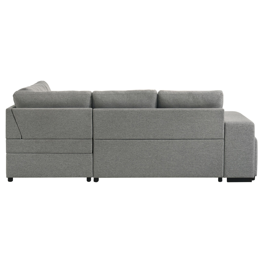 Effortlessly blending beauty and utility, this sleeper sectional invites you to unwind in tailored comfort. Draped in soft grey fabric, its tufted cushions exude quiet elegance, while the generous silhouette offers space to stretch, gather, or dream. Two upholstered stools nest neatly within the armrest, ready for extra seating in an instant. A pull-out bed welcomes overnight guests, and the chaise conceals spacious hidden storage—perfectly designed for life lived beautifully. Key Features: • Sleeper sectional sofa with tufted cushions and clean lines for stylish relaxation • Grey fabric upholstery brings soft texture and versatile modern charm • Pull-out sleeper bed transforms the sofa into a cozy guest accommodation • Lift-up chaise conceals hidden storage for blankets, pillows, or everyday needs • Includes two upholstered stools that nest seamlessly into the sofa armrest • Perfect for compact spaces needing elegant form, comfort, and flexible seating