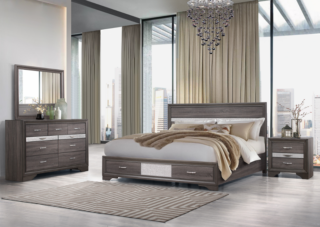 Includes: 1 Bed (Headboard, Footboard, Rails, 1 Dresser & Mirror, 1 Nightstand, and 1 Chest of Drawers