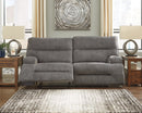 This power reclining sofa makes it hip to be square. Brilliantly boxy profile and wide track arms infuse a highly contemporary look you dont often find in reclining furniture. Rest assured the trendy charcoal-tone upholstery is sumptuously softand made all the more enticing with deep channel tufting for clean-lined flair. The one-touch power control even includes a USB port to keep devices charged while you unplug.