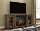Sporting a clean-lined hearty profile and complex chestnut-tone finish this TV stand with fireplace brings home a richly rustic style thats warm and welcoming. Its large-scale design easily accommodates a 75 TV. What really turns up the heat an electric infrared fireplace insert with faux firebrick surround that operates with or without infrared heat and includes a multi flame feature 7-level temperature setting five brightness levels and LED glowing embers effect.